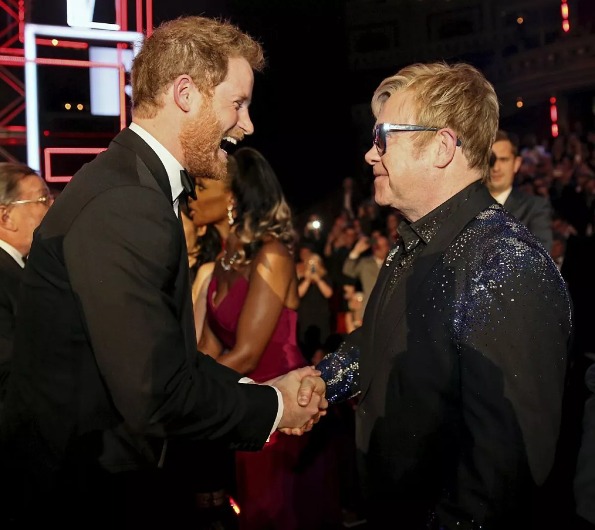 Junto al príncipe Harry y Elton John están el marido del cantante David Furnish, las actrices Liz Hurley y Sadie Frost, y Doreen Lawrence, la madre del adolescente británico Stephen Lawrence, asesinado por motivos racistas en 1993.