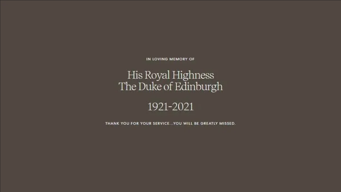 “En memoria de Su Alteza Real”, dice la declaración en su página de inicio en blanco en medio de un fondo gris. “En memoria de Su Alteza Real, el Duque de Edimburgo. Gracias por tu servicio… Se te va a echar mucho de menos”.