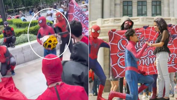 La tierna escena ocurrió en las afueras del Palacio de Bellas Artes en la Ciudad de México. En las imágenes, publicadas por la usuaria Lisset RT (@lisset_rt), se pueden ver a múltiples hombres disfrazados de Spider-Man y algunos de ellos sostienen una enorme tela roja para cubrir al novio que declararía su amor.