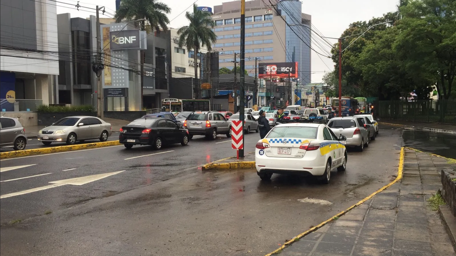 Las tormentas sucedidas desde este miércoles han provocado cortes de energía eléctrica en esa zona de Asunción, razón de las averías. La Policía Municipal de Tránsito (PMT) de la capital ordena el tráfico mientras se aguarda la reposición del servicio semafórico.