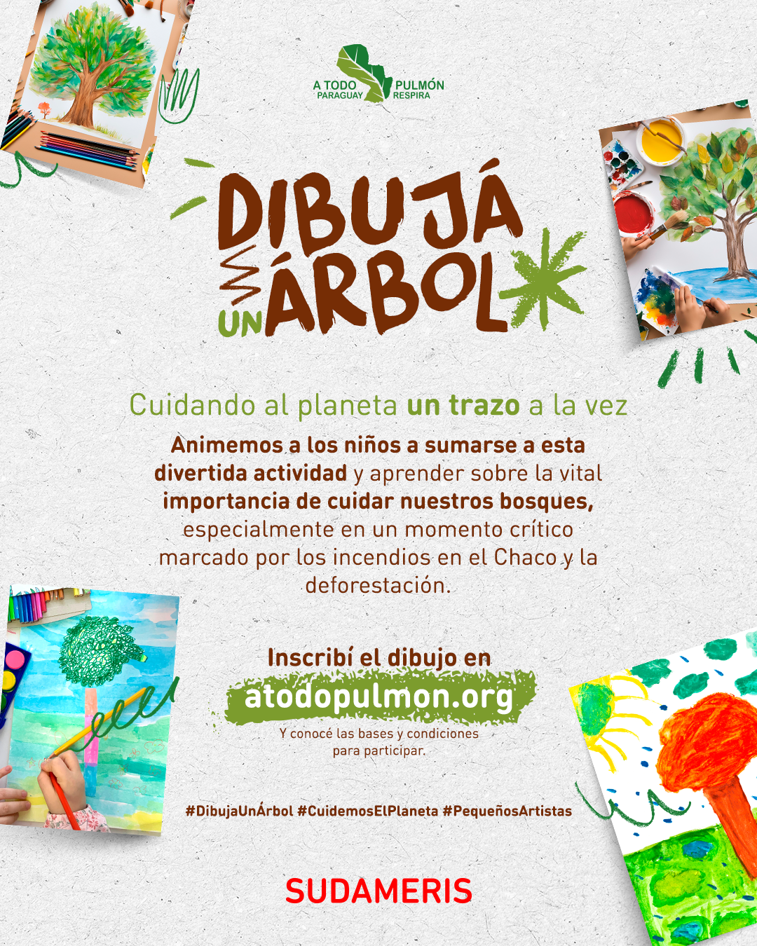 El banco Sudameris y la organización A Todo Pulmón Paraguay Respira realizaron oficialmente el lanzamiento del concurso “Dibujá un Árbol”, dirigido a niños del primero al sexto grado de todo el país. El certamen busca fomentar la conciencia ecológica invitando a los más pequeños a dibujar un árbol, con la posibilidad de ganar premios relacionados con el medioambiente.